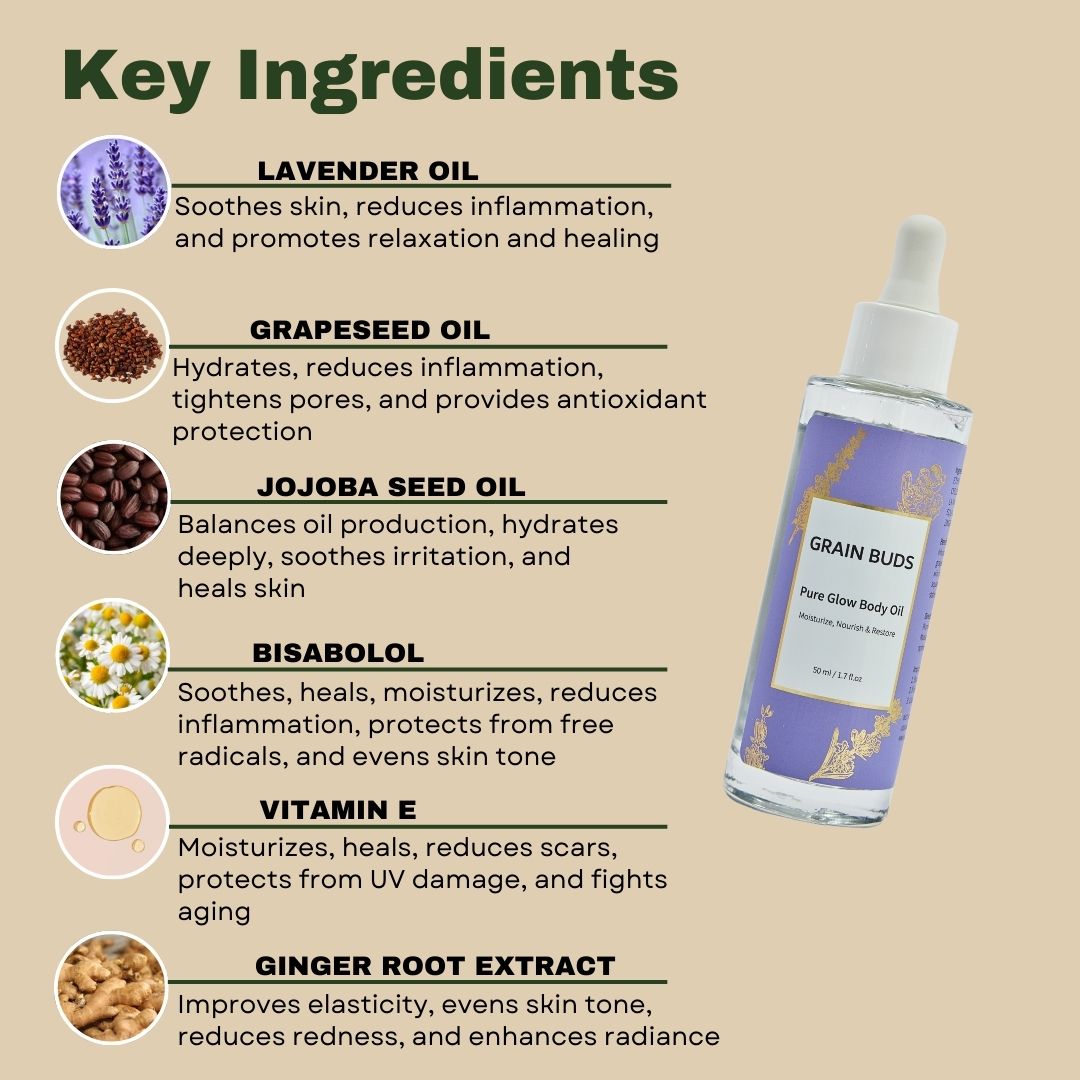 Pure Glow Body Oil is infused with a triple blend of botanical essences including lavender oil, grapeseed oil, and jojoba seed oil, this formula penetrates deep into the skin layers to nourish and soothe, awakening skin vitality. Enhanced with squalane to better repair and fortify the skin barrier, it helps restore skin to a stable and comfortable state.
